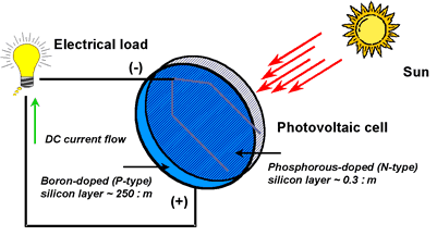 A typical silicon PV cell is composed of a thin wafer consisting of an ultra-thin layer of phosphorus-doped (N-type) silicon on top of a thicker layer of boron-doped (P-type) silicon. An electrical field is created near the top surface of the cell where these two materials are in contact, called the P-N junction. When sunlight strikes the surface of a PV cell, this electrical field provides momentum and direction to light-stimulated electrons, resulting in a flow of current when the solar cell is connected to an electrical load.